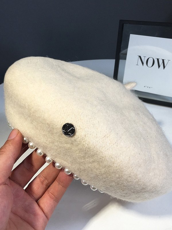Faux Pearl Embellished Wool Blend Beret Hat