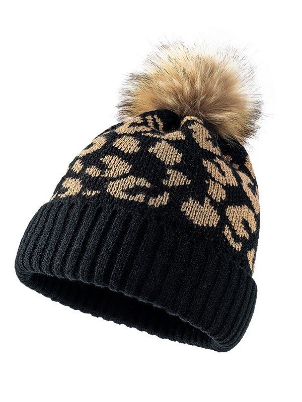 Pompom Leopard Knitted Beanie Hat