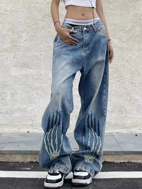 Street Skeleton Hand Print Boyfriend Jeans