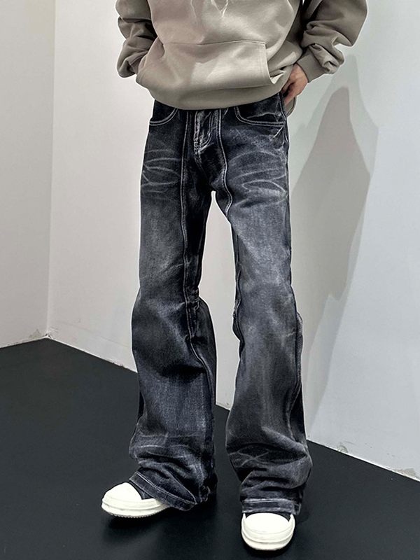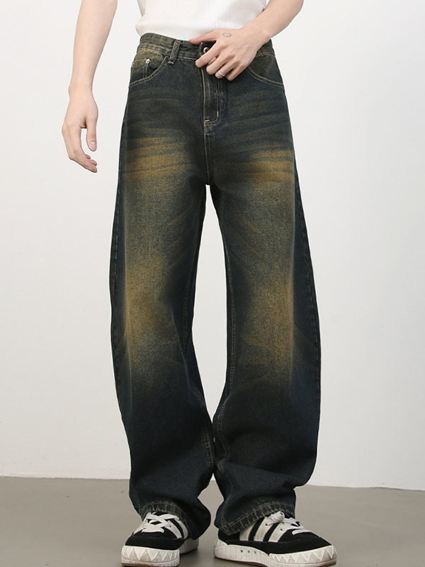 Men’s Vintage Distressed Splice Whisker Wash Loose Jeans