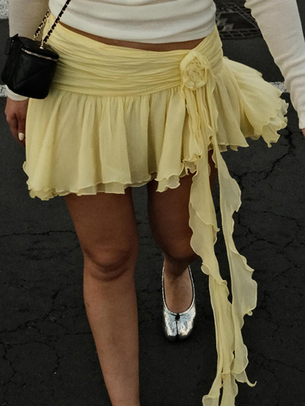 Solid Pleated Lace Lined Irregular Hem Mini Skirt