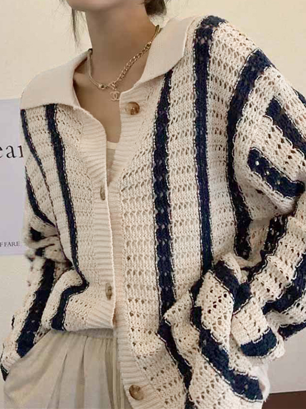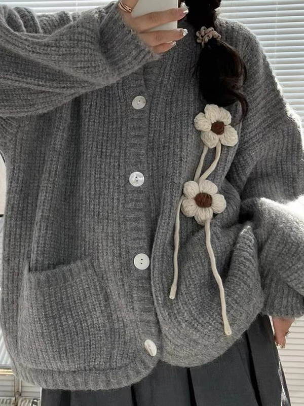 Three Dimensional Flower Decor Crew Neck Knit Cardigan