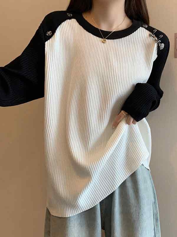 Contrast Color Splice Metal Decor Long Sleeve Knit