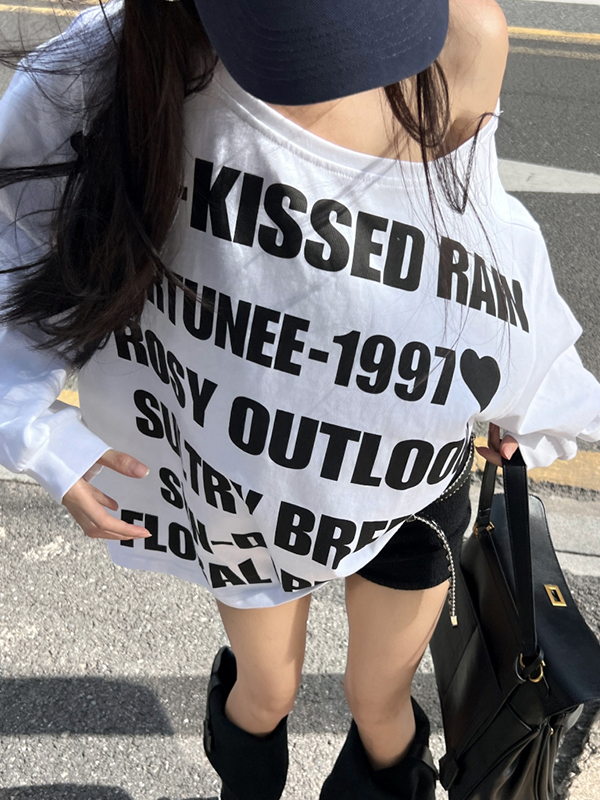 Letter Printed Off Shoulder Oversized Long Sleeve Tee
