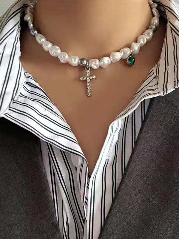 Rhinestone Cross Pendant Faux Pearl Choker Necklace