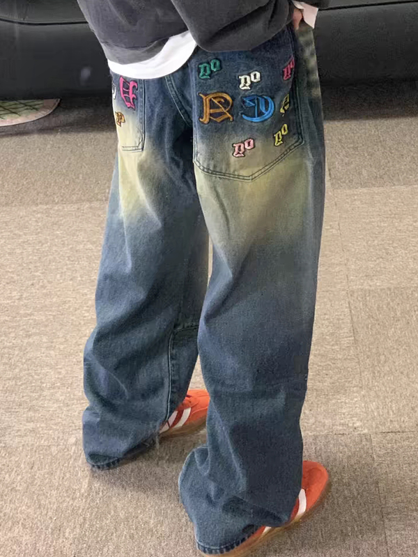 Men’s Vintage Distressed Splice Whisker Wash Loose Jeans